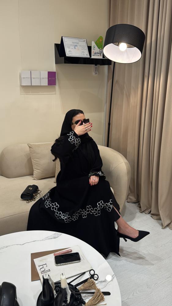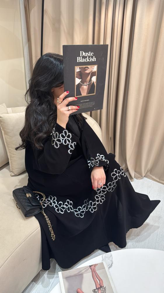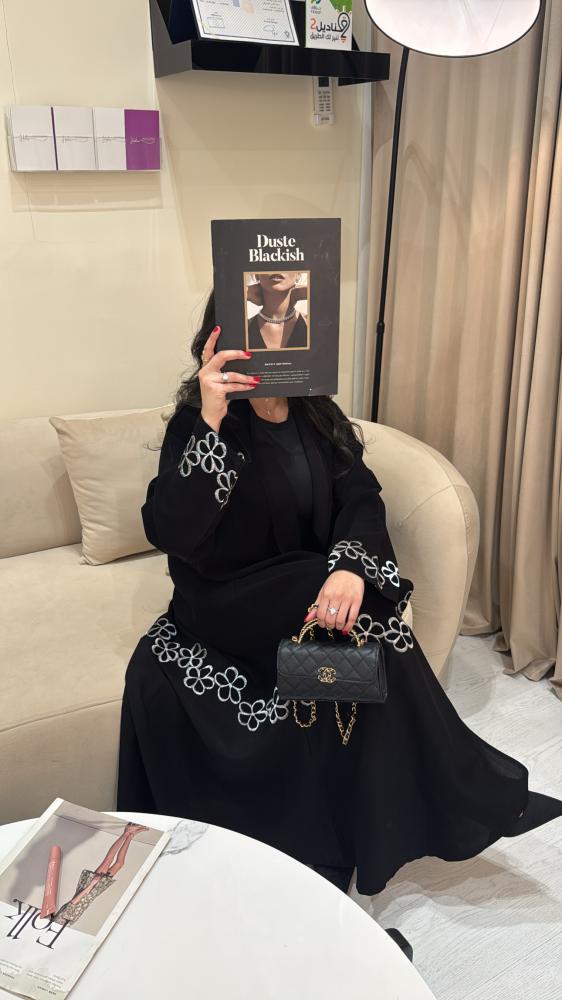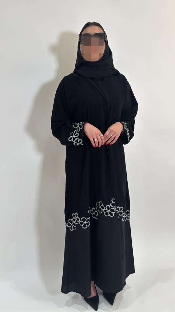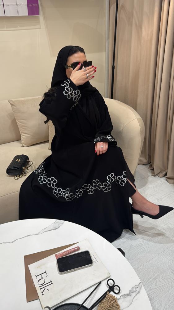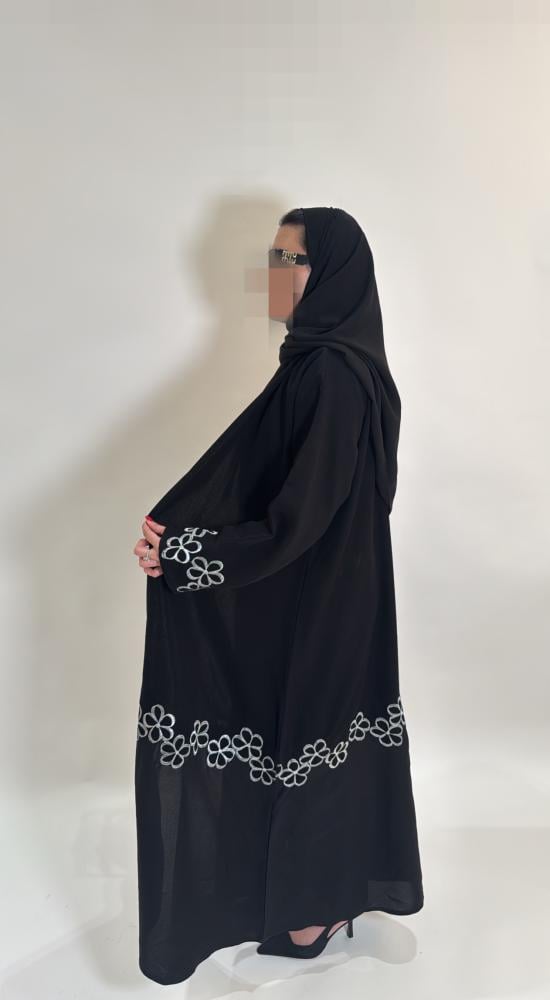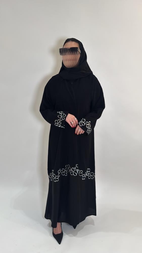 اكمام مطرزه بورود باللون الابيض ، من تحت مطرز باللون الابيضنوعين قماش اللي تحت كريب ، اللي فوق انترنتيوجد طرحه ..